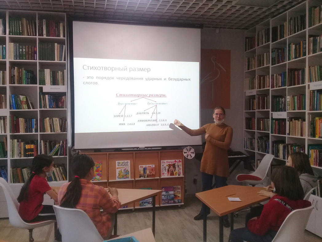 Любителей стихов пригласили в интеллект-зал на «Урок классической поэзии». Библиотекари не только подготовили мультимедийную презентацию об основных стихотворных размерах (ямбе, хорее, дактиле, анапесте и амфибрахии), но и предложили ребятам самим определить, каким стихотворным размером написаны классические поэтические произведения.