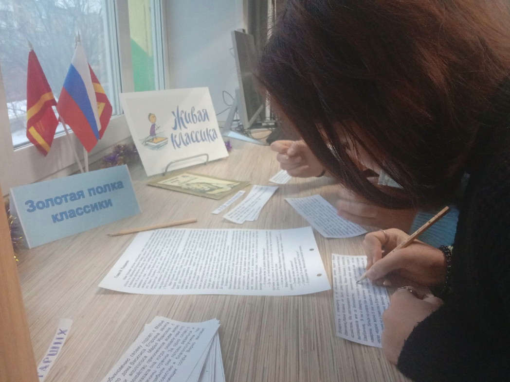 В зале художественной литературы расположилась активность «Классическая высота». На столах и стеллажах были размещены портреты авторов русской классики. Читателям предлагалось разместить названия произведений у портрета их автора. Сложность заключалась в том, что в названиях некоторых книг умышленно были допущены веселые ошибки. Тем же, кто правильно справился со всеми сложностями этого задания, предлагалось выбрать любую книгу с выставки «Книги, которые стоит почитать» и прочесть вслух полюбившийся отрывок.
