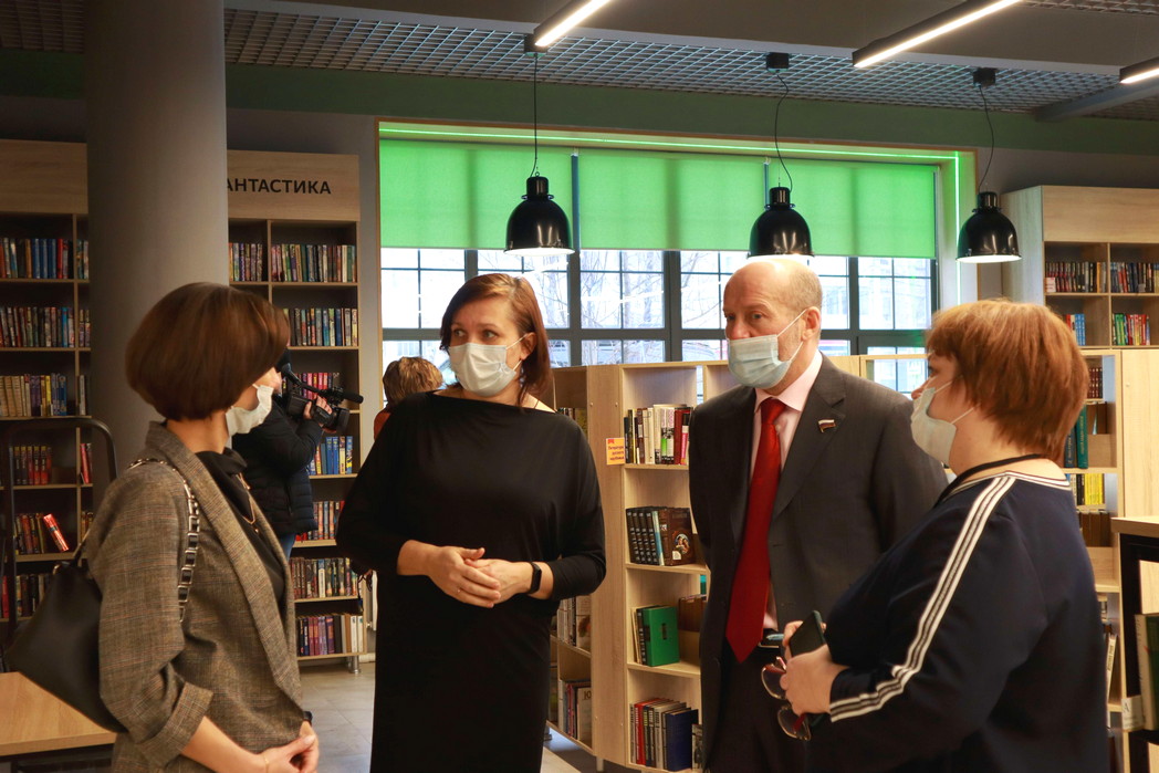 3 февраля библиотеку № 5 «Окна», модернизированную в 2021 году в рамках национального проекта «Культура», посетил с рабочим визитом депутат Государственной Думы от партии «Единая Россия» Олег Колесников. Директор Централизованной библиотечной системы Светлана Прокощенкова и заведующая библиотекой Елена Темникова провели экскурсию по библиотеке, по ее обновленным залам и пространствам.
