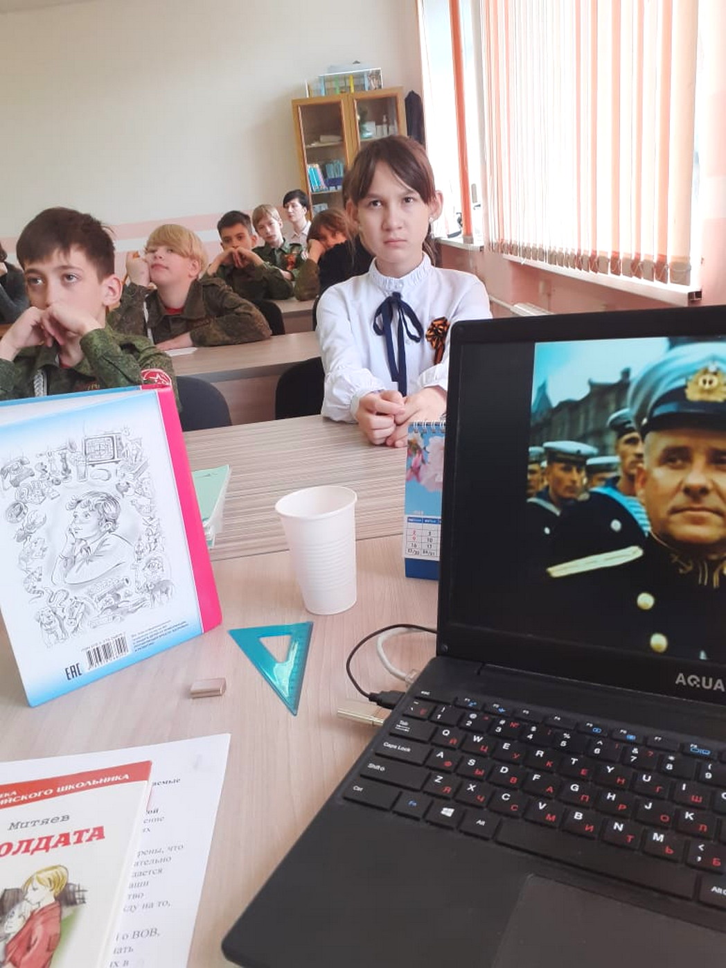 Одновременно сотрудники библиотеки в этот значимый день, 5 мая, провели мероприятия на нескольких информационных площадках. Патриотический час «В книжной памяти мгновения войны» состоялся в школе №36 для учащихся 5-6 классов. Мероприятие прошло в форме патриотического урока, приуроченного ко Дню Победы, посвященного памяти тех огненных лет, героям, не вернувшимся с фронтов, детям войны. Ребята внимательно смотрели видеоролик с парада Победы 1945 года, познакомились с писателями, писавшими о войне для детей и подростков. Особый акцент был сделан на творчестве писателя-фронтовика, участвовавшего в боях и написавшего много произведений о войне для детей. Это Анатолий Митяев, рассказ которого «Мешок овсянки» прочитали и обсудили. Ребята активно приняли участие в обсуждении, отвечали на вопросы. В ходе громкого чтения знакомились со словами военного времени, значение которых было им незнакомо: траншея, вещмешок, салазки и многие другие. Замерев в минуте молчания, почтили память погибших в той страшной войне. Для просмотра были представлены книги А.Митяева, Л.Воронковой, Ю.Драгунского, Л.Кассиля.