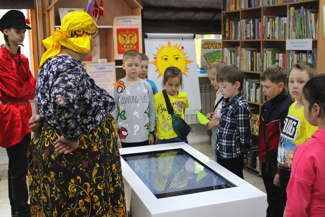 На станции «Символы России» ребята искали флаг родной страны среди похожих флагов других государств, вспоминали строки из российского гимна, знакомились с историей герба России и узнавали столицы государств по их архитектурным визитным карточкам. Всё это стало возможным благодаря специально разработанной студентом Златоустовского техникума технологии и экономики Мироном Мельником компьютерной игре, помогающей рассказать детям о серьёзных официальных символах в занимательной форме, и интерактивному столику, которым оснащена первая модельная библиотека города Златоуста.