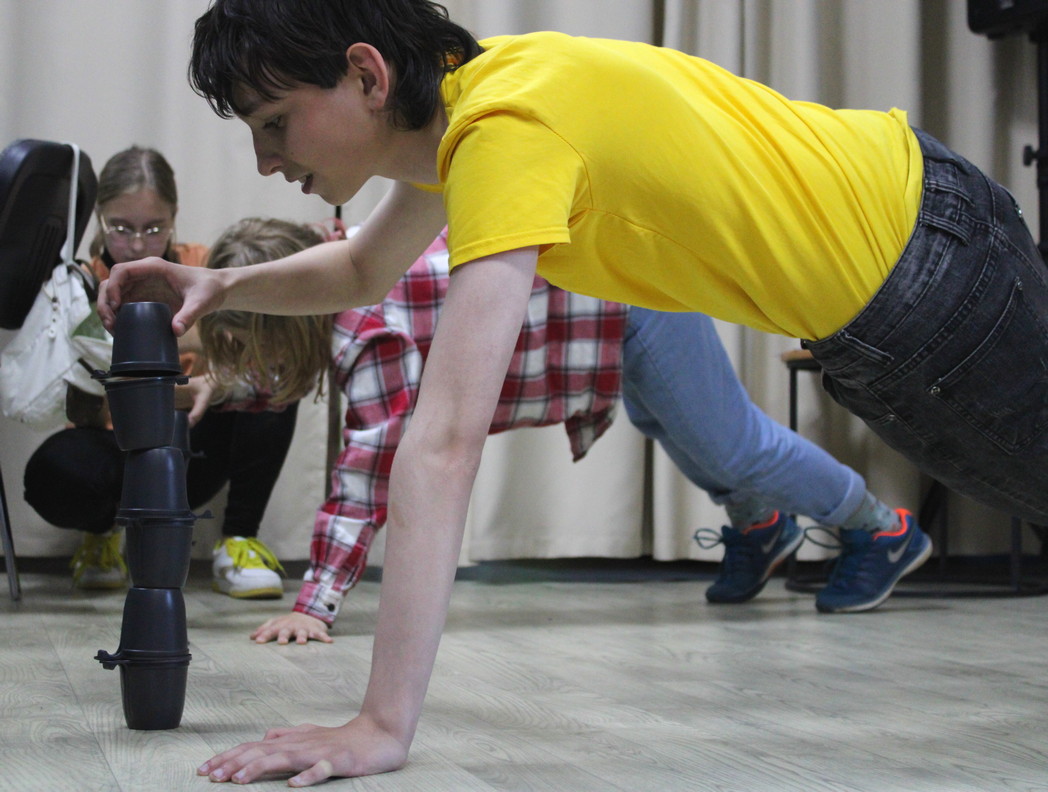 Ну, а в пятом туре «Физкультура» подростки работали в команде: ловили кольца с помощью деревянных мечей, при помощи воздушного шарика перетаскивали пластиковые стаканчики. Показали, как умеют работать китайскими палочками в конкурсе «Суши мастер» и строили горку в упоре лёжа.