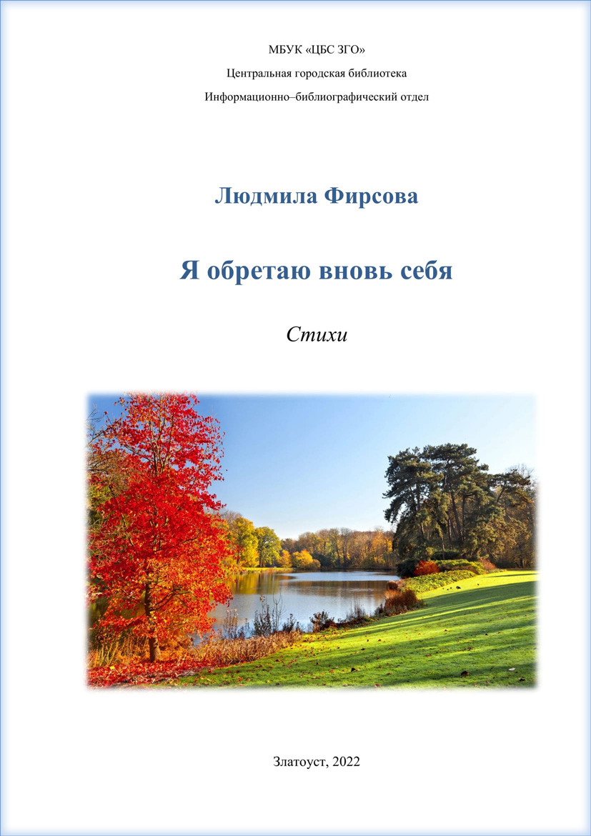 Вышел новый сборник стихов «Я обретаю вновь себя» златоустовской поэтессы Людмилы Фирсовой. Сборник подготовили и издали библиографы Центральной городской библиотеки.У поэтессы это первый сборник, хотя отдельные её стихи печатались в Челябинском издательстве «Фрегат». В сборник вошло около 70 стихов на самые разные темы: размышления о жизни, о любви, о природе и о родном городе.