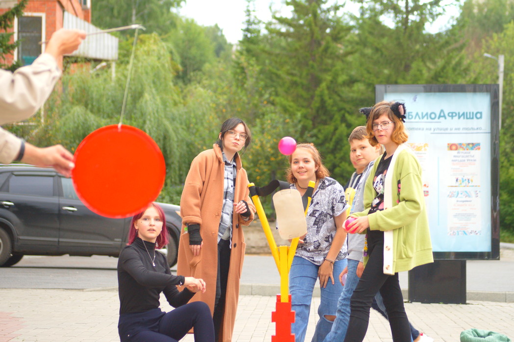 2 августа День позитивного общения «В народном стиле» на площади Центральной городской библиотеки начался с разминки для ума и тела. Любителям позитива предложили ответить на летние загадки и, выполняя упражнения, подготовиться к танцевальному марафону.
