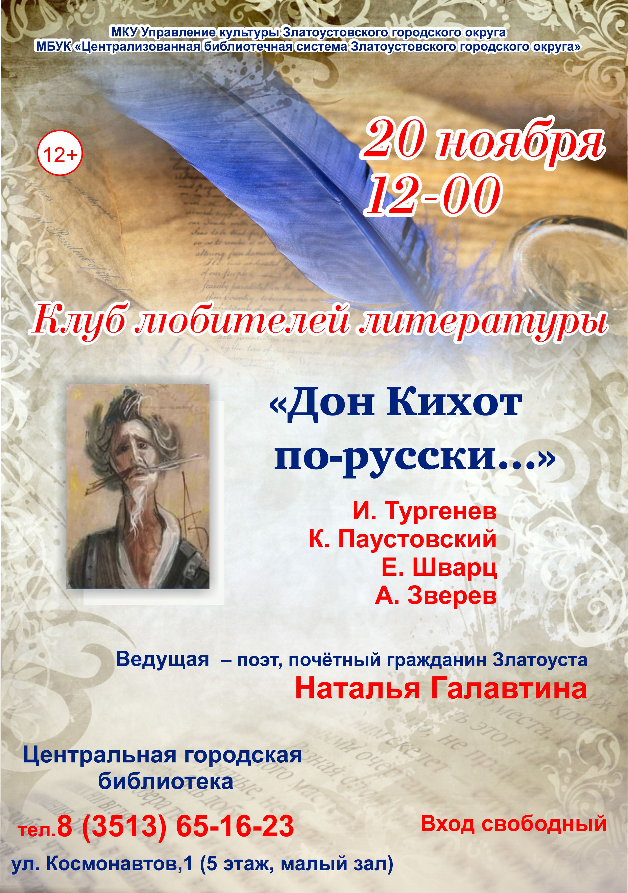 10 November 2022 Клуб любителей литературы "Дон Кихот по-русски..." Добавить комментарий Имя E-Mail Я согласен(а) на обработку моих персональных данных Отменить
