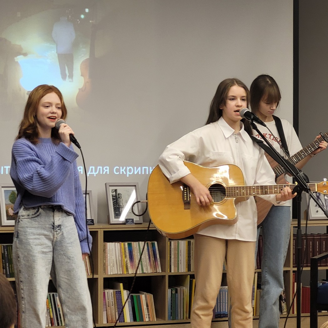 Творческую, теплую атмосферу вечера поддержали музыканты. Тон задал профессионал, преподаватель Детской музыкальной школы №2 Максим Валавин. Следом выступили и юные музыканты - группа «Сказки времени» и Мария Янкина с песней «Лети».