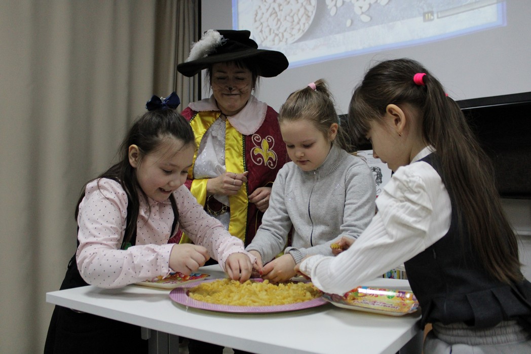 Юные книголюбы помогли Коту в сапогах вернуть названия сказкам в игре «Узнай сказку», в задании «Музей сказочных вещей» угадывали, из каких произведений волшебные предметы, в конкурсе «Собери пазл» складывали изображения героев сказок, а также попробовали себя в роли Золушки, поучаствовав в игре «Золотые руки Золушки». А Кот в сапогах научил ребят весёлым играм – «Кот и мыши» и «Доберись до Кота».