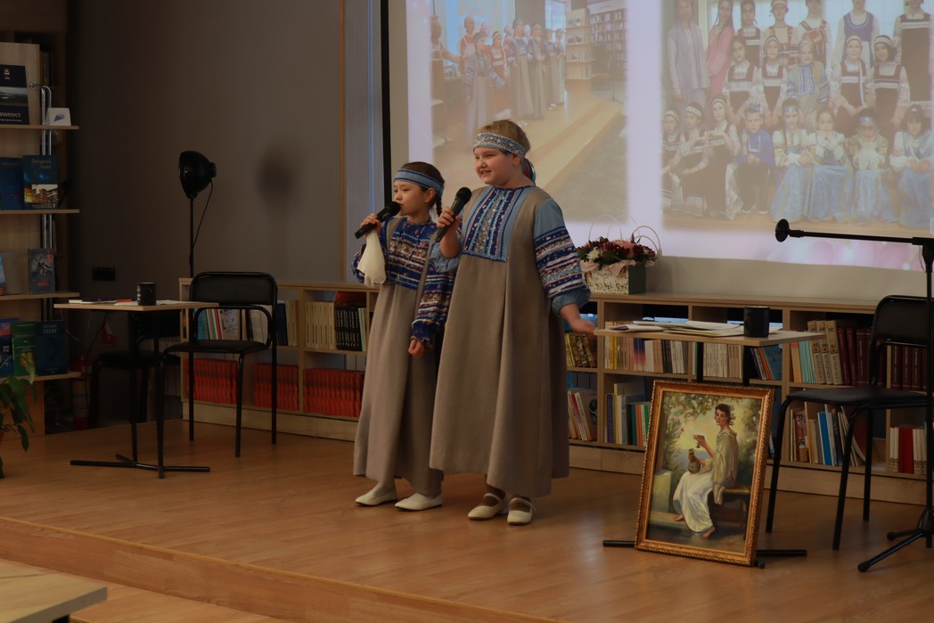 «Учебный» день в библиотечной школе был насыщенным и интересным. На переменах между «уроками» звучали песни в исполнении участников образцового детского фольклорного ансамбля «Лапоточки»: Хужиной Вероники и Шариповой Ксении.