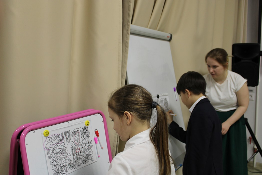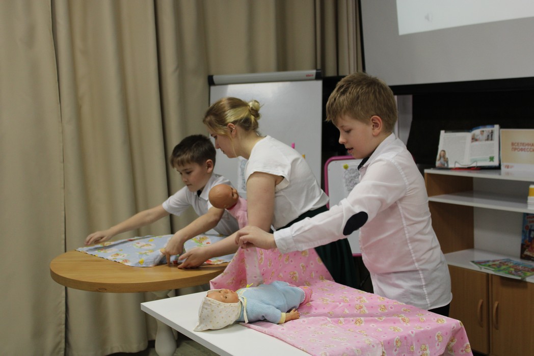 Знакомство с другими профессиями социальной сферы проходило на практике, а полученные знания и навыки закреплялись в играх. Дети попробовали себя в роли зоозащитников: в игре они находили «потерявшихся» животных и раскрашивали их цветными фломастерами. Узнали школьники о том, кто работает в домах малютки и научились пеленать детей. Познакомились с обязанностями социального работника и сиделки дома престарелых. А игры «Донеси сумку» и «Стул-каталка» помогли школьникам понять особенности работы с пожилыми гражданами. В завершение занятия ребята познакомились с профессией тьютора, узнали о его работе и обязанностях.