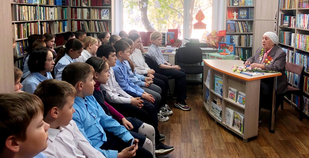 Накануне Дня Великой Победы детская библиотека № 13 приняла участие в 14-й Международной акции «Читаем детям о Великой Отечественной войне». В рамках акции состоялась встреча читателей с ветераном войны, блокадницей Мустафиной Фанузой Шайдулловной. В Год педагога и наставника для громкого чтения выбран рассказ Льва Кассиля «У классной доски». Прочитав выдержки из рассказа и обсудив прочитанное, слово взяла гостья мероприятия. В прошлом Фануза Шайдулловна работала учителем русского языка и литературы, поэтому рассказ «У классной доски» ей хорошо знаком. Она всегда хотела быть похожей на главную героиню – учительницу Ксению Андреевну Карташову. Восьмилетней девочкой Фануза Шайдулловна в августе 1942 года была эвакуирована из блокадного Ленинграда на Урал. Закончив Сулеинскую среднюю школу, поступила в Златоустовское педагогическое училище. После его окончания работала в Улан-Удэ Республики Бурятия в школе глухонемых детей. На встрече в библиотеке Фануза Шайдулловна показала ребятам азбуку букв глухонемых, прочитала стихи о Победе и рассказала о тяжёлых годах страшной войны.