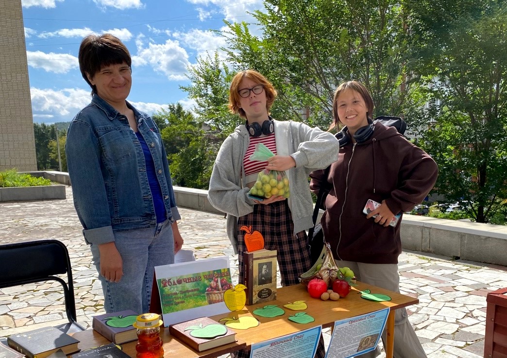 К просмотру были представлены «Яблочные рецепты от русских классиков»: любимый «Яблочный пирог» Александра Пушкина, «Янтарный торт» от Татьяны Толстой, дочери Льва Толстого, «Цветаевский яблочный пирог» Марины Цветаевой. Рецепты, напечатанные на красочных яблочках, были вручены всем взрослым участникам праздника. Юным гостям были предложены вспомнить стихи, поговорки, пословицы и даже песни о яблоках. За верные ответы вручали вкусное августовское угощение – яблоко.