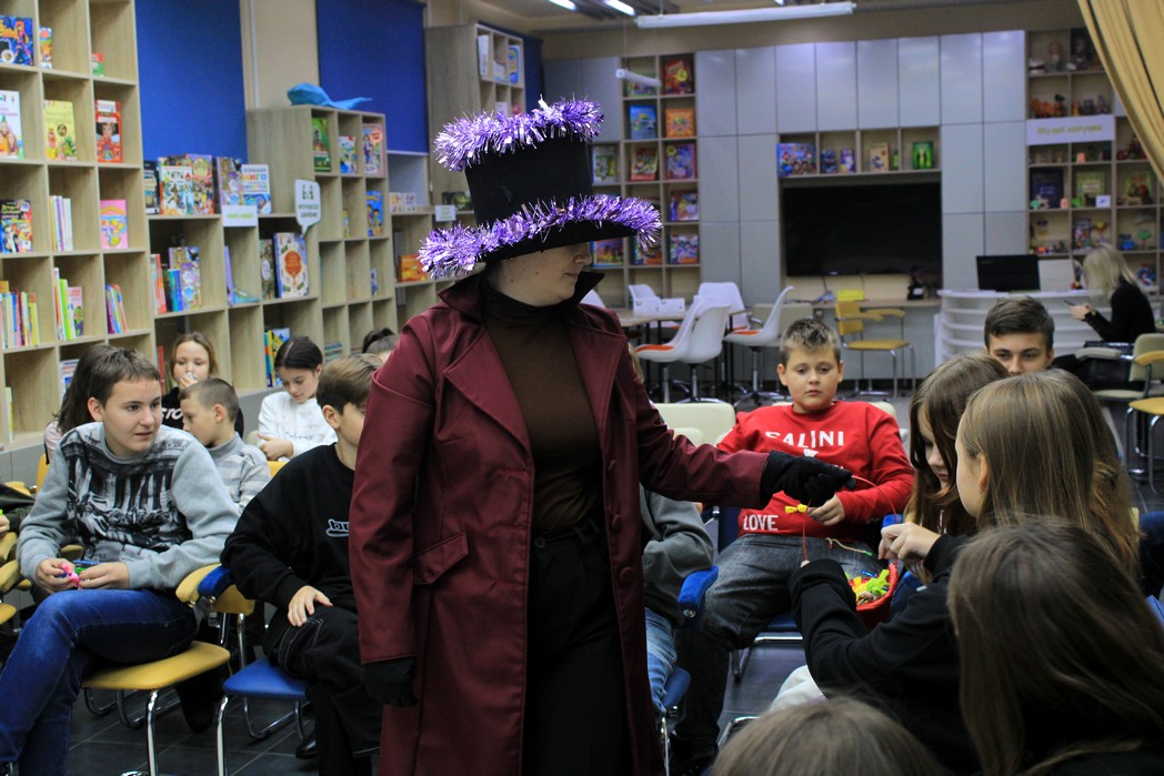 В библиотеке-игротеке детей ждало увлекательное «путешествие» на шоколадную фабрику из сказочной повести Роальда Даля «Чарли и шоколадная фабрика». Встречал гостей эксцентричный кондитер мистер Вонка, который поделил их на команды и вручил маршрутные листы по фабрике. Маршрут привел детей на станцию «Шоколадная комната», где они проявили свои логические способности и с помощью предложенных карточек выполнили задание игры «Мемо». Не менее сложным и интересным явилось задание в «Цехе изобретений». Здесь ребята не просто узнали историю возникновения шоколада и его производства, но и попробовали своими руками создать лакомство. На станции «Ореховый БУМ» проявили свою эрудицию и с успехом «раскололи» орешки, найдя нужные ключи к правильным ответам. Не обошлось в этот день и без веселой музыки. Вместе с Умпой-Лумпой они пели, танцевали и отгадывали мелодии на станции «Тайна тянучки». В процессе игры ребята познакомились с новым интерактивным оборудованием библиотеки.