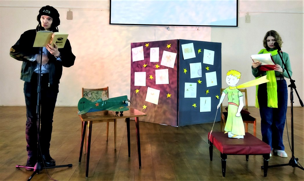 Члены «Клуба любителей литературы» Елена Жабкина и Николай Аракчеев зачитали поразительнейшие письма Экзюпери полные боли, печали и любви. Были инсценированы строки философской сказки. Со сцены звучали главы о Розе, Короле, Честолюбце, Пьянице, Деловом человеке. На главе о Фонарщике Наталья Анатольевна прочитала свои стихи. Затем на сцене появился Лис и Лётчик, благодаря их диалогу зрители поняли истину «Зорко одно лишь сердце! Самого главного глазами не увидишь!»