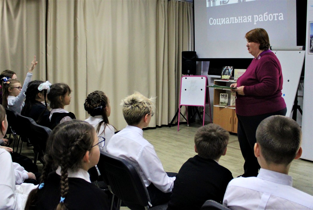 В новом году в библиотеке семейного чтения № 2 «Аист» возобновились ежемесячные профориетационные встречи для школьников в рамках библиолаборатории «Вселенная профессий». Январское занятие было посвящено профессиям социальной сферы.