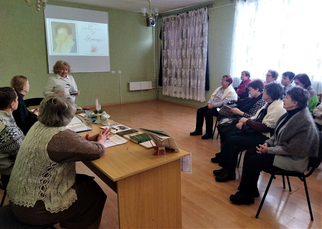 Рассказ о Пушкине, ведущая клуба – Наталья Анатольевна Галавтина, разделила на восемь периодов жизни: Вундеркинд, Француз, Сверчок, Романтик, Реалист, Влюблённый, Пушкин осенний, Великий русский гений. Помогали ей в этом рассказе книги из её личной библиотеки, привезённые из поездок по пушкинским местам – «В садах лицея», «У лукоморья» С. Гейченко, «По Пушкинскому заповеднику» В. Бозырева, последние с автографами авторов. Все гости смогли подержать книги в руках, полистать и посмотреть в ходе повествования Натальи Анатольевны.