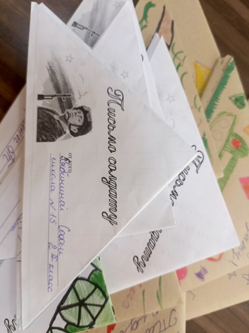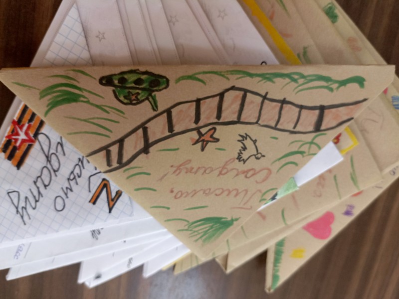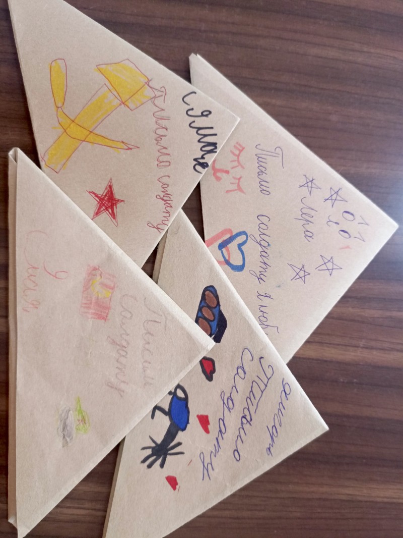 Первые письма написали юные читатели детской библиотеки №13. Дети обращаются к бойцам с просьбой скорее вернуться домой и другими пожеланиями: счастья, победы, удачи. Большинство писем украшено рисунками. Школьники также цитируют разные стихи: