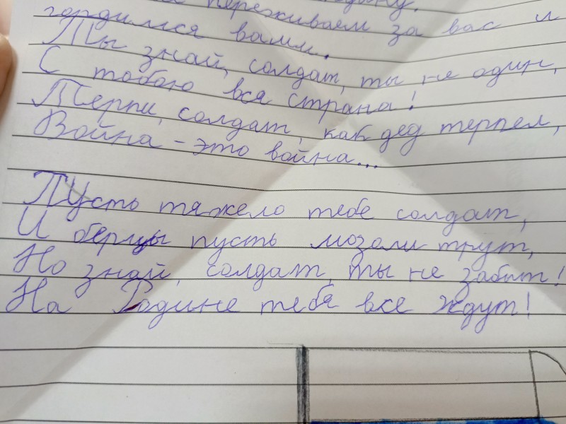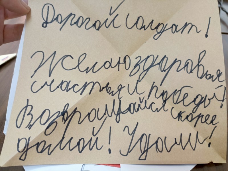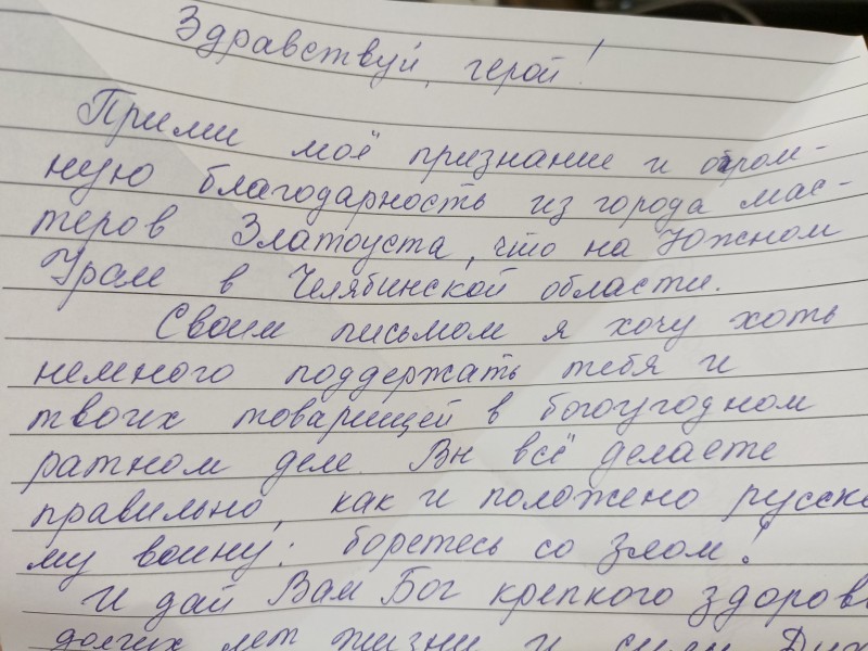 «Нам очень нужны письма, а особенно - от детей, - говорит боец из Златоуста Евгений (позывной Честер). – Если есть возможность, обязательно пишите, нам будет очень приятно. Неважно, попадет ли письмо к бойцу из Златоуста или из другого города. К нам в часть попали письма от первоклассников и девятиклассников города Обнинск. Они написали свои пожелания, и это очень поддерживает наш боевой дух!».