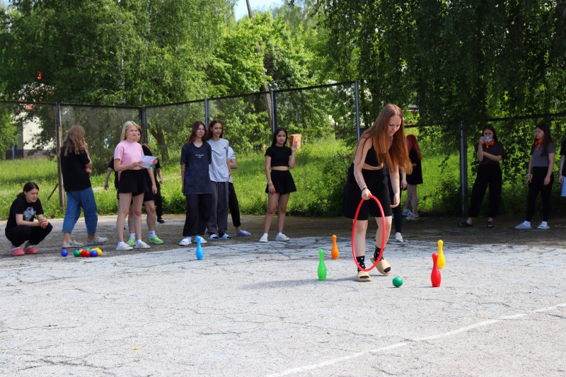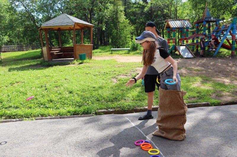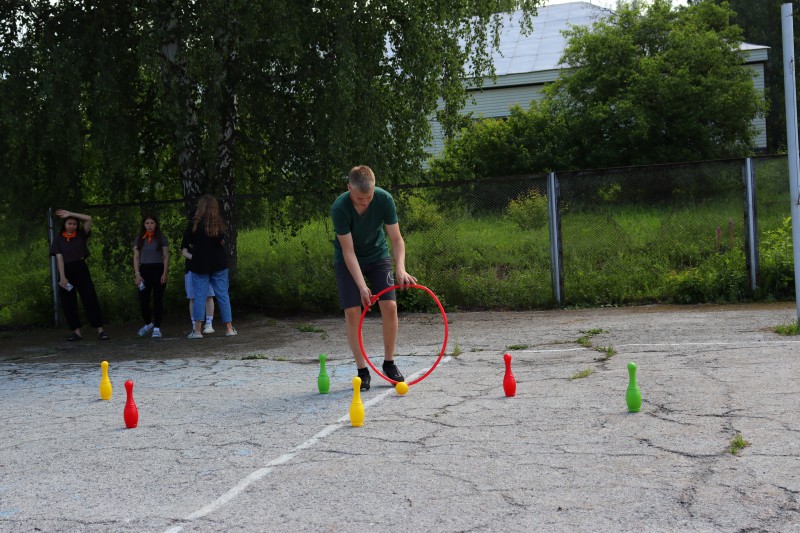 Спорт стал основной темой игры, которая прошла в формате путешествия по станциям. Разделившись на четыре команды, ребята прошли испытания на четырех станциях. Так, на станции «Перекати поле» необходимо было перекатить все мячи через кегли в корзину, используя при этом обруч. А на станции «Забег в мешках» - показать ловкость и меткость при бросании колец.