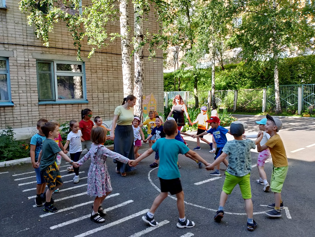 Ещё одной точкой хороводной активности стала площадка у детского сада №4 на Северо-Западе. Здесь утром по средам ребята подготовительных групп под руководством хороводоводов из библиотеки семейного чтения №2 «Аист» тоже готовятся к мероприятию 15 августа.