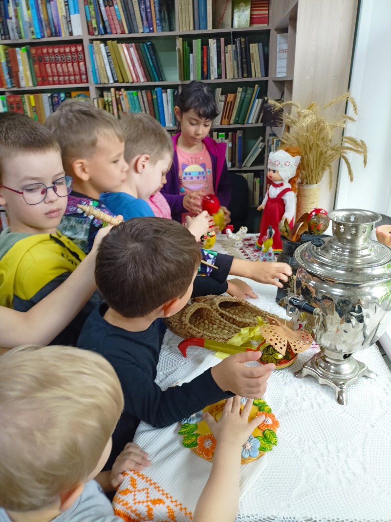 Ребята отправились в «Виртуальный музей русской избы», где узнали о предметах быта, которые использовались в старину и о символе дома и семьи – рушнике. Библиотекари рассказали, что главное место в избе занимала печь, вокруг которой собиралась вся семья. Дети услышали стихотворение про печку «Наша толстая Федора».
