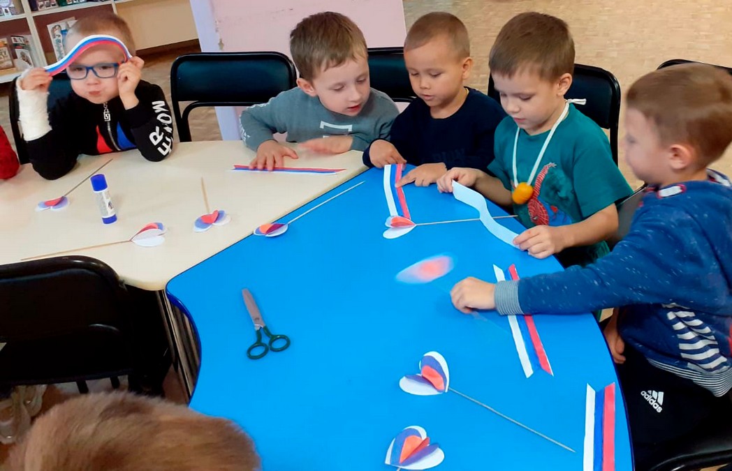 Не обошлось и без творческого задания. Дети сделали флажки с сердечком из бумаги и шпажек в цветах нашего государственного флага.