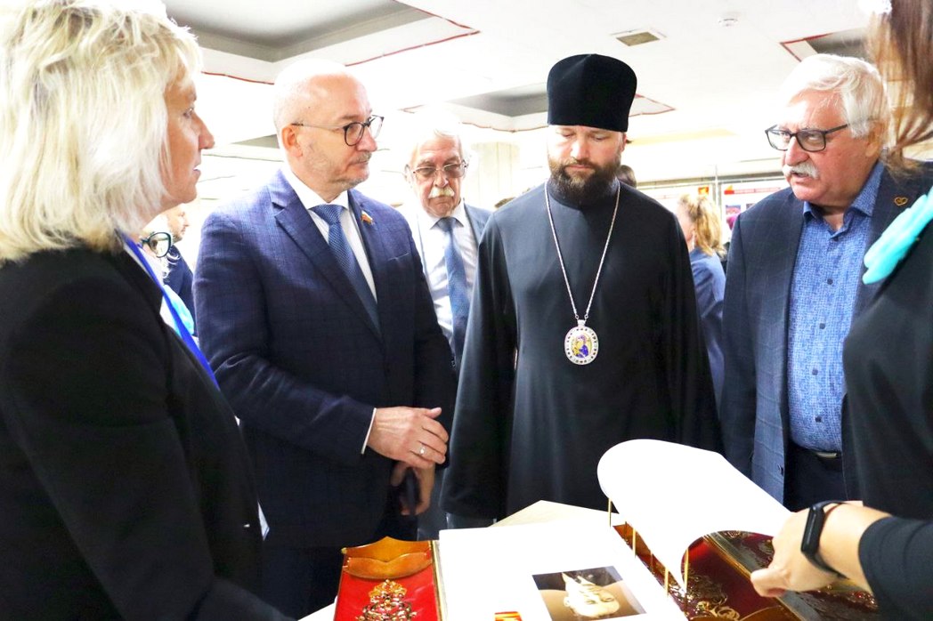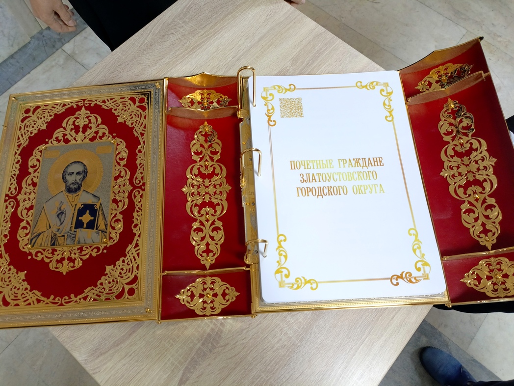 В экспозиции было представлено новое, уникальное по своему исполнению издание – Книга Почетных граждан Златоустовского городского округа. Книжный оклад — декоративное покрытие переплетной крышки книги – выполнено на Златоустовской оружейной фабрике в знаменитой технике златоустовской гравюры на стали. Идея создания именно такого формата Книги (ранее в 2006 и 2017 г.г. выходили печатные издания о почетных златоустовцах) принадлежит Собранию депутатов Златоустовского городского округа, принявших решение увековечить память о горожанах, которые внесли неоценимый вклад в развитие и процветание нашего города. Работа над книгой велась более полутора лет. Храниться эксклюзивный экземпляр будет в Собрании депутатов Златоустовского городского округа.