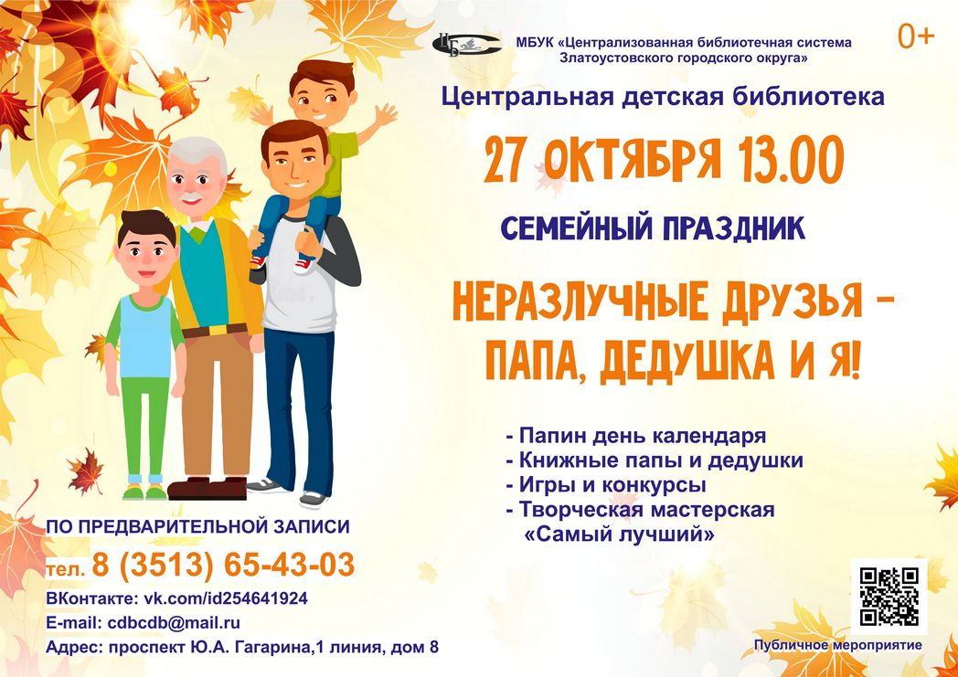 27 октября в Центральной детской библиотеке пройдет праздник «Неразлучные друзья – папа, дедушка и я!». Он посвящен Дню отца, который набирает все большую популярность в нашей стране и отмечается в октябре.