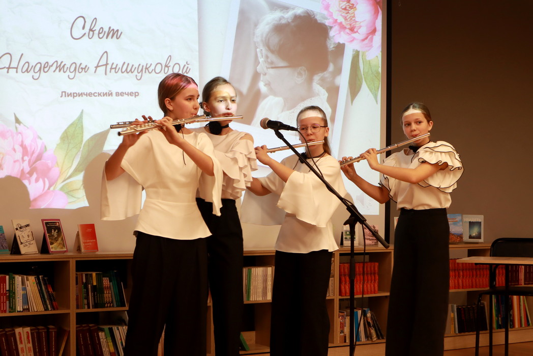 В качестве музыкального подарка звучали композиции в исполнении ансамбля ДМШ №2 «Поющие флейты» под руководством Юлии Фаттаховой. Марина Аксёнова исполнила любимую песню поэтессы.