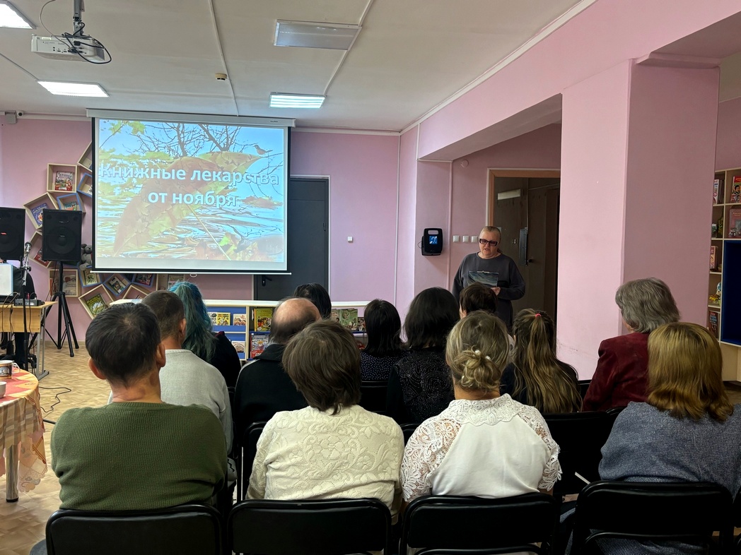 Библиограф Елена Егорова подготовила обзор литературы «Книжные лекарства от ноября», которые могут поднять настроение и вдохновить. В список вошли произведения, наполненные жизненной энергией, юмором и радостью. Каждый участник мог выбрать «лекарство» по своему вкусу — от лёгких романов до увлекательных приключений, которые дарят положительные эмоции и согревают душу.