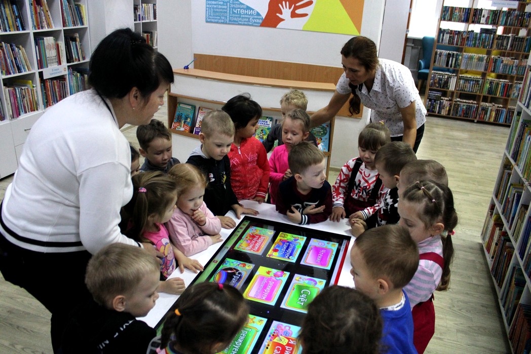 Знакомство дошкольников с библиотекой началось с экскурсии. Маленькие посетители побывали во всех залах библиотеки. В Зале семейного чтения узнали о детском уголке, где и книжки, и игрушки, и гамаки. А еще всех поразил «большой компьютер» – интерактивный стол, где можно и поиграть, и порисовать.