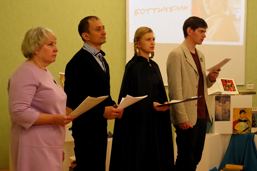 Участники клуба Марина Аксёнова, Тамара Степанова, Николай Аракчеев, Валерия Кунафина, АнастасияДунаева представляли отрывки из книг, добавив к рассказу живой элемент. Ярким украшением встречи стало выступление девушек - учениц прекрасного преподавателя литературы Натальи Степановны Дымковой. Девушки и Иван Шевелёв представили историю любви Марка Шагала и Беллы Розенфельд. Это позволило гостям буквально прикоснуться к истории искусства и ощутить атмосферу творческого вдохновения.