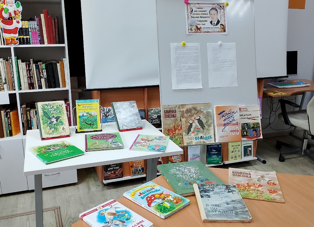 Многие из произведений писателя-натуралиста были представлены на выставке в интеллект-зале. У этой выставки библиотекарь не только рассказала о книгах и зачитала отрывки из них, но и провела для ребят викторину по рассказам Сладкова.