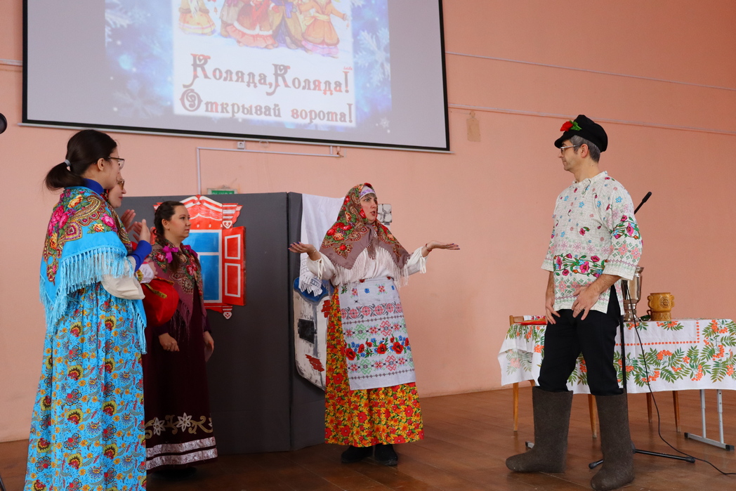 В большом зале библиотеки ребята посмотрели театрализованное представление с «выкупом избы» и колядованием, узнали, что такое подблюдные песни, поцелуйные игры, в словарях и справочниках искали «святочные» понятия: «колядка», «ряженые», «рождество», «Васильев день» и т.д. А также стали непосредственными участниками всех обрядовых действ. Гадали на свое будущее, на исполнения желаний, бросали валенки, стараясь узнать на имя суженного или суженой. Играли в народные игры «Матрешка», «Селезень и утка», «Ходим в гости» и учились танцевать круговые танцы и хороводы.
