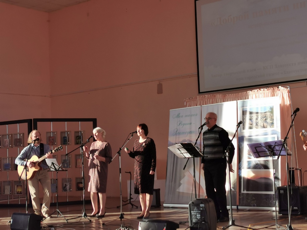 Ведущие Анна Катаева и Иван Шевелёв напомнили, что этот концерт уже стал традицией. В третий раз библиотека и Клуб имени Юрия Зыкова собрали зрителей, чтобы вспомнить тех, кто внёс вклад в культуру Златоуста. На сцене звучали песни и стихи известных авторов и местных поэтов, включая произведения Юрия Зыкова, Евгения Банникова и других. Особое внимание было уделено памяти ушедших друзей и коллег, чьи имена и лица появлялись на экране.