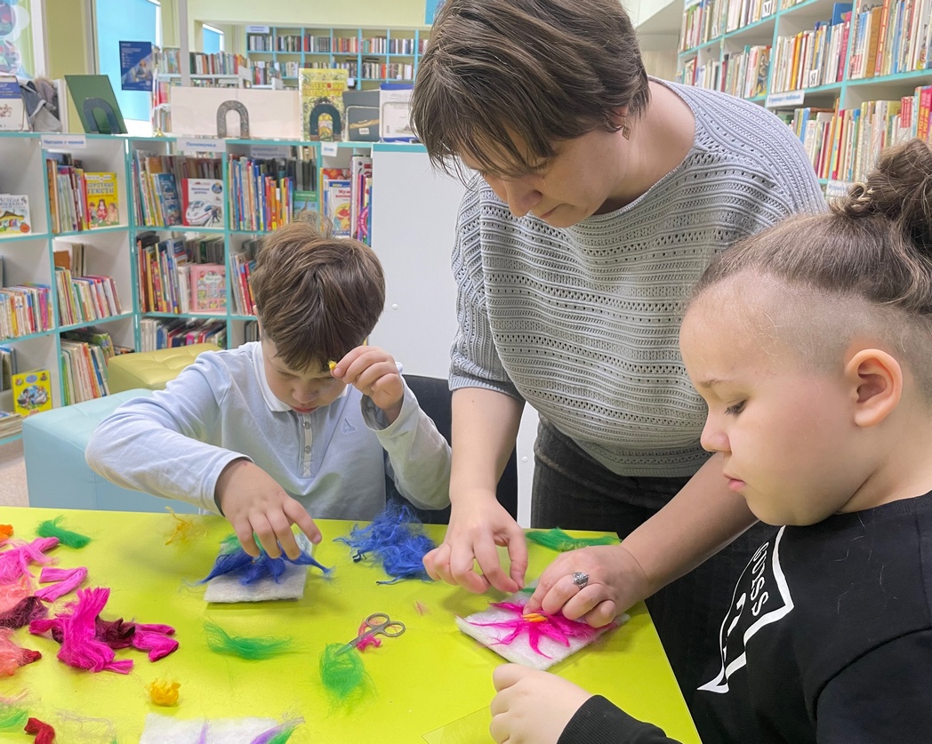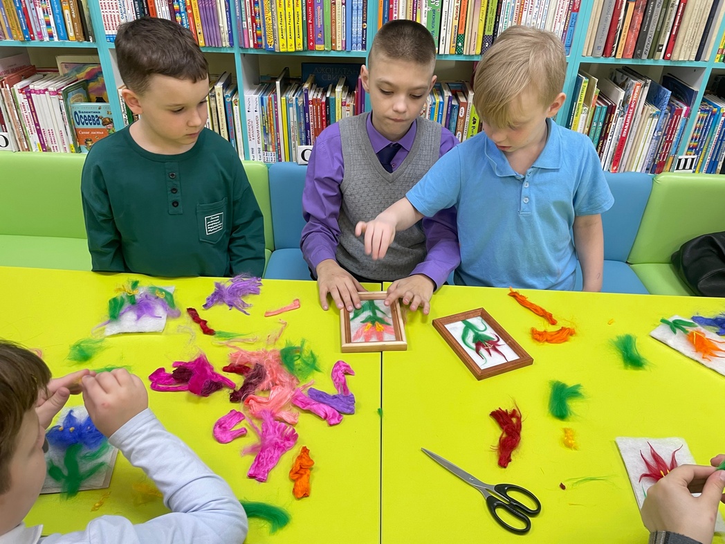 В конце мероприятия под руководством опытного в рукоделии библиотекаря Елены Алябышевой дети создали весеннюю картину из шерсти для своих мам и бабушек. Каждый ребенок старался вложить частичку своей души в подарок, делая его уникальным.
