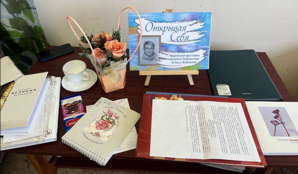 В секторе искусств оформлена выставка увлечений и интересов нашей героини. Присутствующие на встрече смогли убедиться, какой это увлекающийся человек, жадный до всех до всех проявлений в искусстве. Наша героиня – разносторонняя личность. Елена увлекается флористикой, создает коллажи, фотографирует: у нее получаются впечатляющие снимки природы; пробует себя в живописи и в графике.