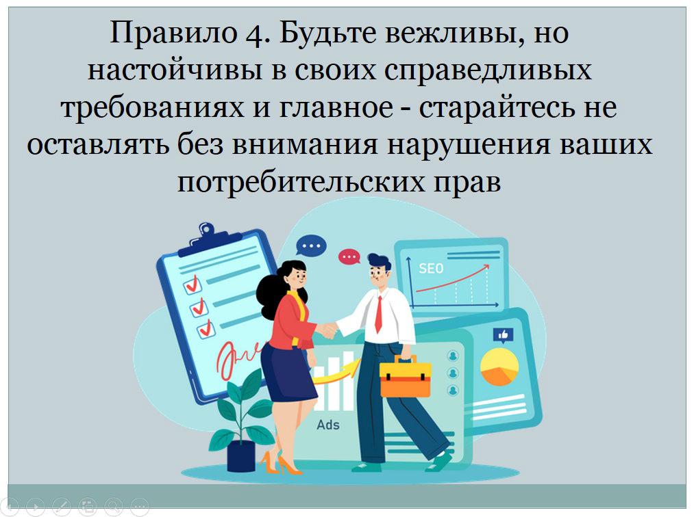 Библиотекари рассказали студентам о том, кто такой потребитель, как его защищает российское законодательство и как действовать потребителю в случае, если его права нарушаются. Подробнее остановились на главных основаниях, необходимых для обмена и возврата продукции, а также на товарах, которые не подлежат обмену и возврату.