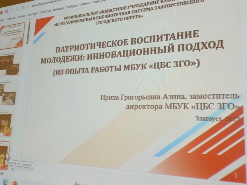 Златоуст представил коллегам два доклада. Об опыте инновационной работы по патриотическому воспитанию молодежи, ярких находках и необычных формах работы библиотек Златоуста рассказала заместитель директора Ирина Азина.