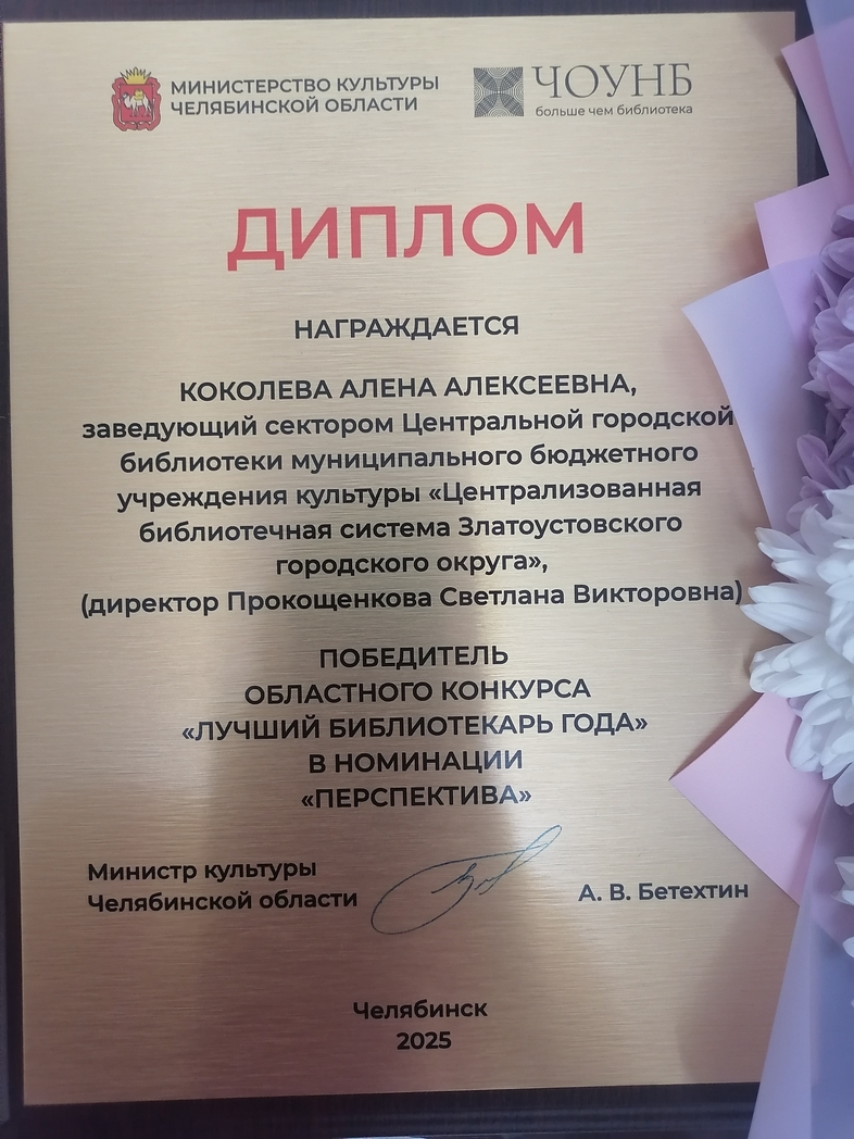 В библиотечной профессии Алена с 2019 года. С 2021 года руководит сектором Центральной городской библиотеки по работе с юношеством. С 2024 года она лидер «Уникумов» – объединения молодых библиотекарей Златоуста. 2025 год стал для Алены знаковым: она окончила обучение в Челябинском государственном институте культуры по направлению «Библиотечно-информационная деятельность», победила в профессиональном конкурсе МБУК «ЦБС ЗГО» на премию имени Е.А. Гужевой в области развития библиотечного дела. И вот новая заслуженная победа уже на областном уровне!