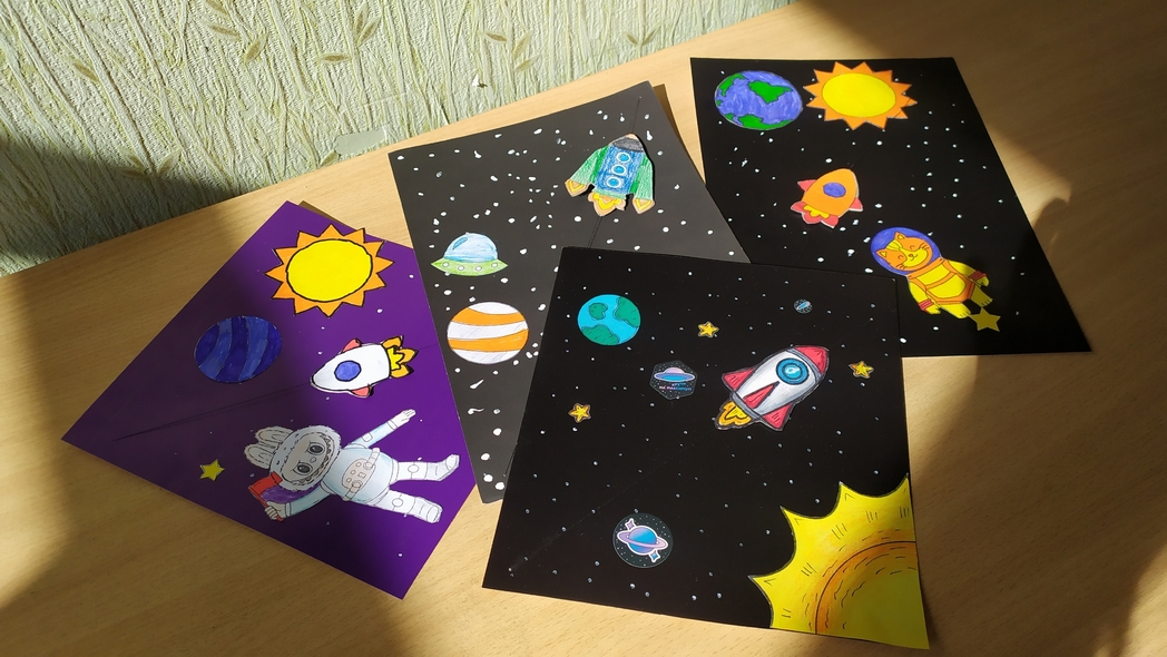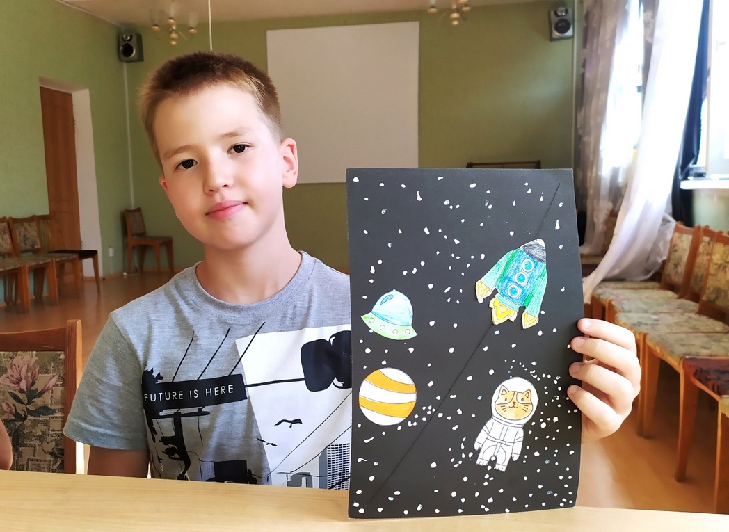 На практической части встречи дети создавали «Страницу космоса». Под специально подобранную «космическую» музыку каждый участник оформлял свою уникальную композицию с изображениями звезд, планет, животных и ракет. Работу выполняли в технике «аппликация», а также использовали специальный приём, который создавал иллюзию движения ракеты по странице.