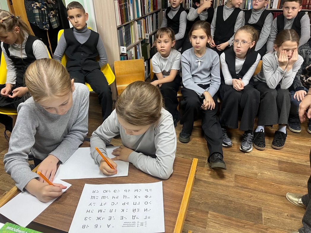 Поговорили и о специальных книгах со шрифтом Брайля для слепых и слабовидящих. Ребята узнали, что такое рельефно-точечный шрифт, его особенностях, а также попробовали прочитать сказку Павла Бажова «Серебряное копытце», написанную шрифтом Брайля. В завершение мероприятия участники попробовали написать фразу «Я вижу сердцем» с шрифтом Брайля.