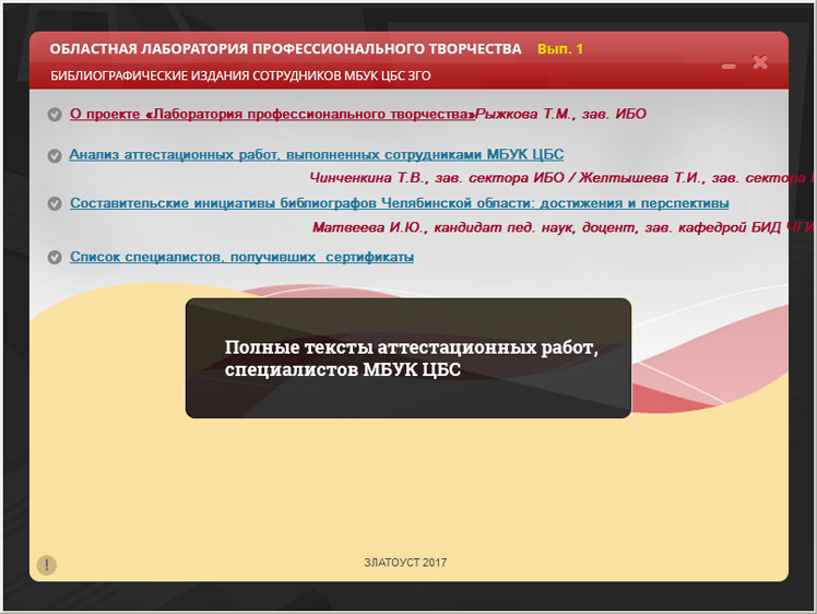 В 2016 году стартовал проект «Лаборатория профессионального творчества». Это совместный проект Центральной городской библиотеки и Челябинского государственного института культуры. Он реализуется на базе информационно-библиографического отдела ЦГБ г. Златоуста.
