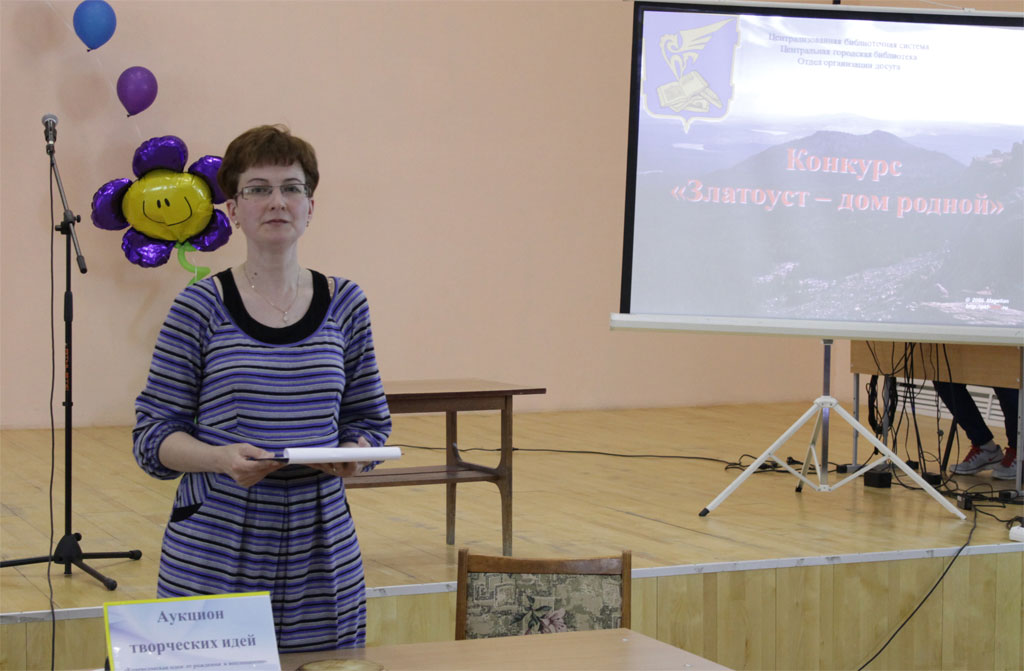 Целый ряд интересных неординарных идей был представлен на Аукционе. Среди них: конкурс чтецов «Златоуст – дом родной» (отдел организации досуга ЦГБ), круглый стол «Патриотизм – знак вопроса» (читальный зал ЦГБ), краеведческий час-портрет "Я – Златоустовец»" (библиотека № 5 «Исток»), виртуальное путешествие по родному городу «Я – Златоустовец» (библиотека № 2 «Аист»), устный журнал «Емельян Пугачев на Южном Урале» (детская библиотека №8), творческий проект школы и библиотеки «Экологический кодекс города» (библиотека № 21 «Дом друзей»).