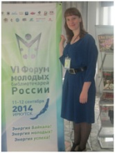 2. О.С. Невзорова с 11 по 12 сентября 2014 года приняла участи в работе VI Форума молодых библиотекарей России «Библиотека без границ: развитие и реализация потенциала молодежи в интересах России», прошедшем в г. Иркутске на оз. Байкал. Организаторы Форума: Министерство культуры Российской Федерации, Министерство культуры и архивов Иркутской области, Иркутская областная юношеская библиотека им. И.П. Уткина, Российская библиотечная ассоциация. Девиз Форума - «Энергия Байкала! Энергия молодых! Энергия успеха!».
