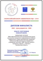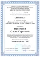 3. В 2014 году О.С. Невзорова стала победителем в областном конкурсе «Лучший библиотекарь года» в номинации «Перспектива», заняла III место во Всероссийском конкурсе «Библиотекарь года-2014», в рамках которого отмечена Дипломом финалиста и специальным призом АПРИКТ «Библиотечный лидер» - сертификатом на обучение по программе «Технология работы в формате Национальной электронной библиотеки: ресурсы, сервисы, услуги».